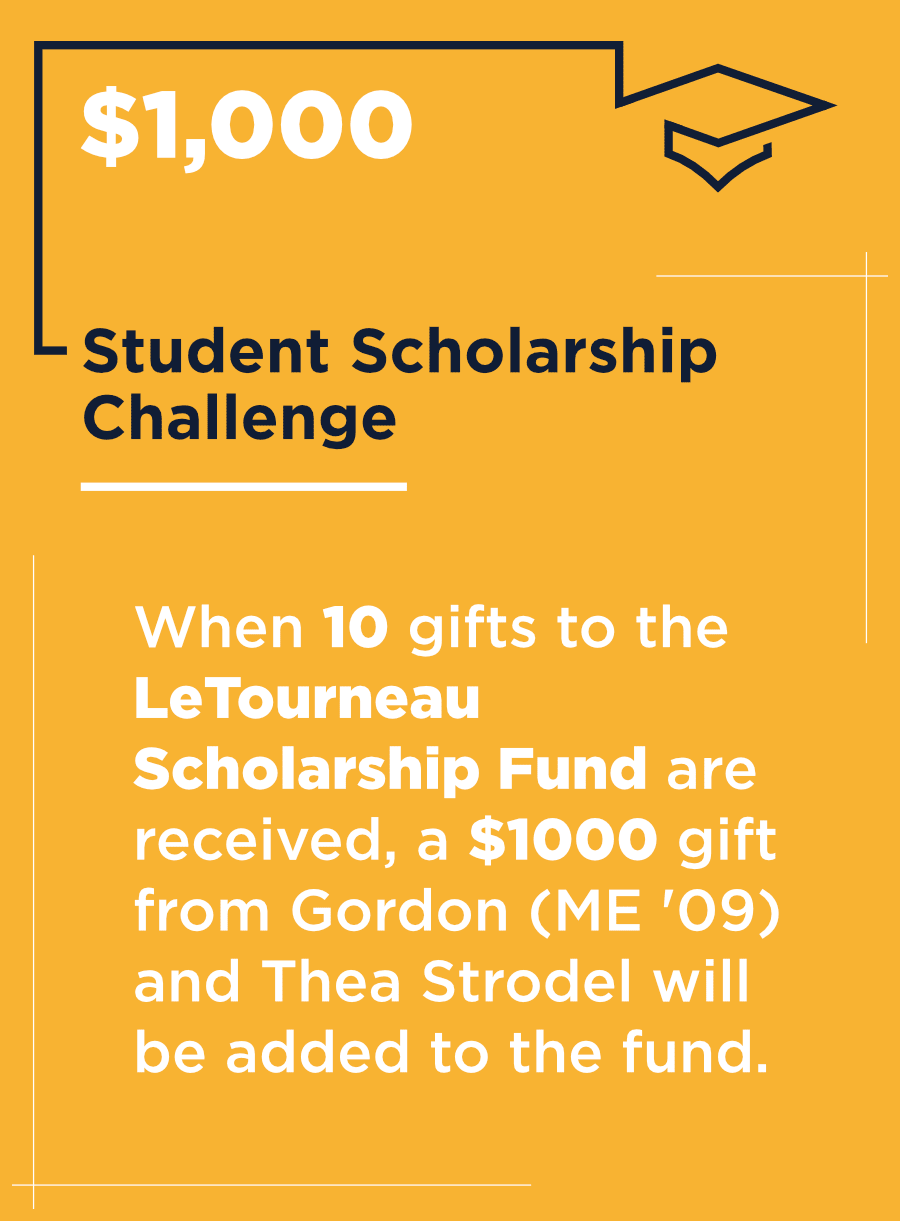 Gifts in this area primarily support student scholarships, helping lower the cost of a LeTourneau education and making it possible for more students to attend. For many, this support is the difference between pursuing their degree—or not.