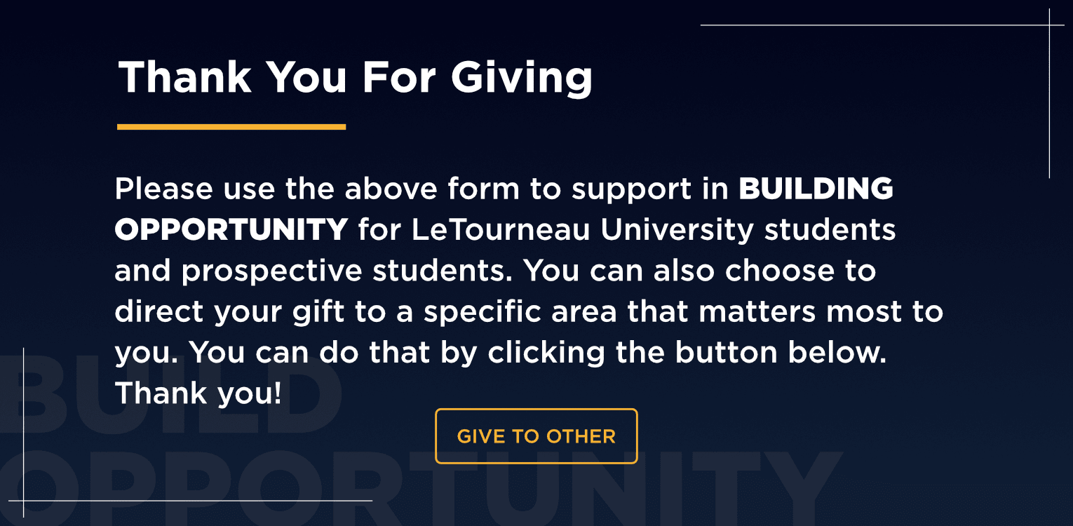 Called to Build Opportunity focuses on opening doors for students through scholarships and student support. Gifts to this priority help remove financial barriers, making it possible for more students to say “yes” to a Christ-centered LeTourneau education and remain on the path God has placed before them. Through this support, students are able to pursue their calling with greater confidence, stability, and freedom—equipped to grow academically, spiritually, and personally at The Christian Polytechnic University.