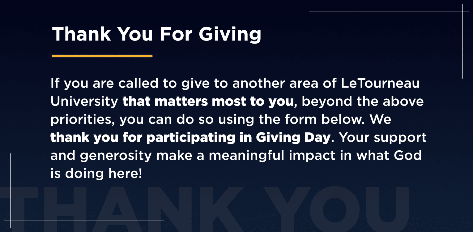 Giving Day is a time for the LeTourneau community to come together around a shared purpose. Today, we gather in a shared act of generosity. This year, we are Called to Build—investing in students through opportunity, discipleship, and innovation. Every gift, of any size, helps shape lives and support the incredible work God is doing through LeTourneau University.